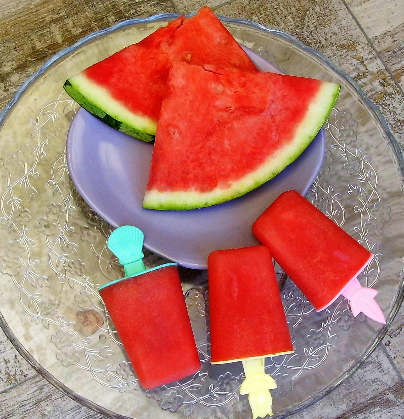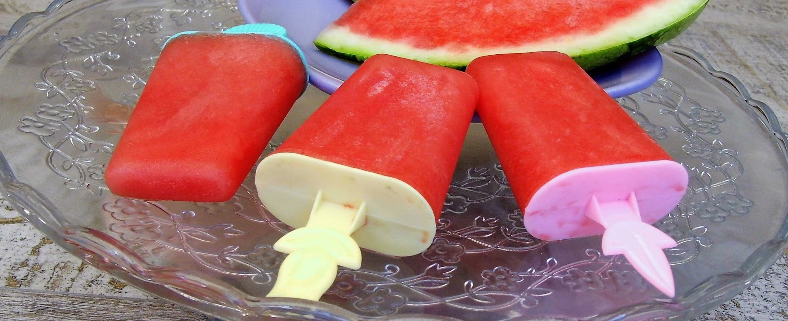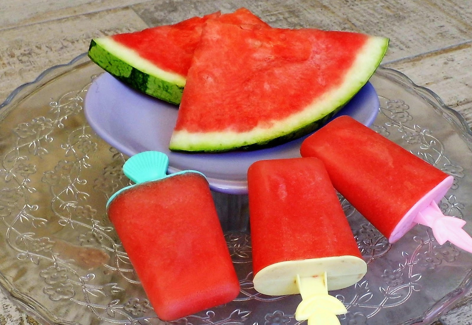Venga!!! Apunta la receta!!!Esta receta no contiene gluten ni colorantes, es apta para intolerantes a muchos alimentos como el huevo y los lácteos.Para 6 polos medianos:· 4 rodajas de sandía (Del tamaño normal, como si las fueras a comer)· 2 cucharadas de azúcar (Esto será a gusto de cada uno)· 50 ml de aguaEn primer lugar limpiamos la sandía de pepitas y la cortamos en trozos, la echamos a un vaso apto para batidora y agregamos el resto de ingredientes, batimos hasta que quede totalmente sin grumos, probamos a ver si nos gusta más o menos de dulce y si está perfecto a nuestro gusto metemos la mezcla en moldes para polos, congelamos unas horas y ya están listos para consumir.