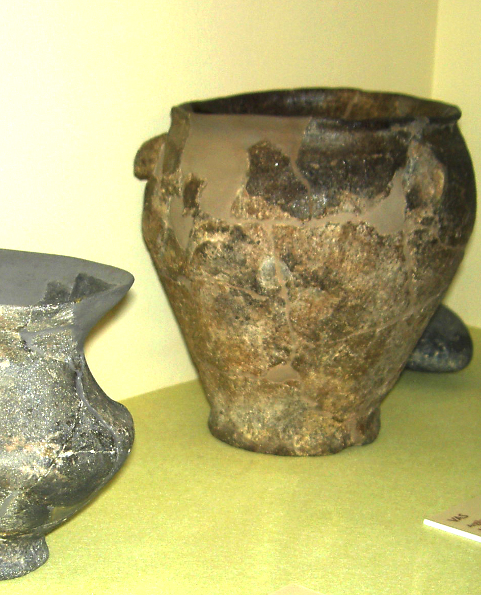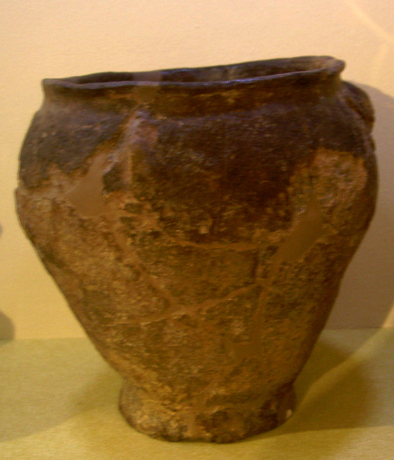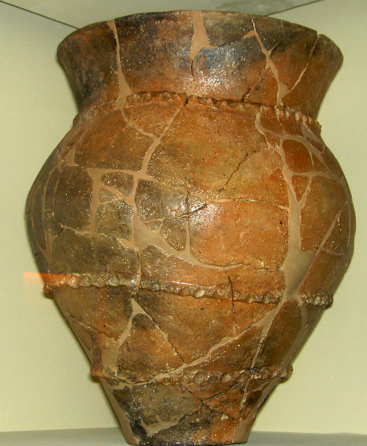 Gran vaso de almacenaje a mano con cordón aplicado.Destacan los vasos con forma de perfil en ese, de base plana, cuerpo globular, y borde exvasado, decorados a veces con cordones digitados aplicados. También se encuentran vasitos globulares más pequeños, así como lebrillos y platos.