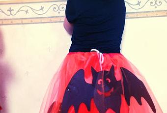 Entonces pienso en tunearla un poco... y le pongo los murciélagos... El resultado es el que veis.. .lo bueno es que a ella le ha encantado y se fue feliz de la vida con su falda de bruja y la camiseta del mostacho. Como nos sobraba algo de tul, pues a modo de fular... que hoy hace mucho frío y ... listo !