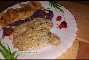 Lo primero que vamos a hacer es macerar el pollo con las especias, para ello en un bol ponemos 4 cucharadas de aceite de oliva, las especias elegidas y el pollo, y dejamos en la nevera unas horas.A la hora de preparar el plato, lo primero que vamos a hacer es preparar la salsa, para ello cocemos un poco de lombarda y reservamos, en una sartén pochamos la cebolla finamente picada, cuando esté pochada añadimos la lombarda cocida y rehogamos, cuando veamos que los ingredientes estén bien integrados salamos y añadimos un chorrito de vino, subimos el fuego y dejamos que se evapore, pasamos la verdura a un vaso de batidora y trituramos. Reservamos.En la misma sartén, que podemos aprovechar, vamos a preparar los filetes, para ello los sacamos del bol, y con el mismo aceite que lleva de la maceración los hacemos a la plancha.Por último sólo queda montar el conjunto, en un plato ponemos la salsa que hemos preparado y añadimos unos piñones por encima, además podemos acompañar con láminas muy finas de manzana, que bañaremos con unas gotas de vinagre balsámico. Y por último el pollo. Un plato fácil y rápido de preparar, con productos de temporada.¡Que aproveche! Nos vemos en el próximo post.Realizado por Jorge Ibarra Morato