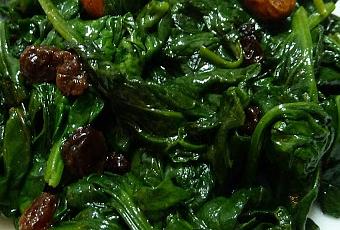 1 manojo de espinacas frescas 2 cucharadas de pasas 2 cucharadas de almendras Aceite Sal Pimienta
