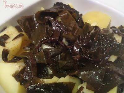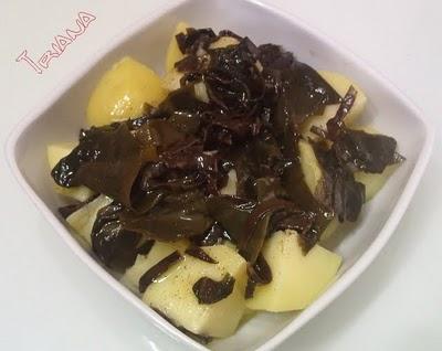 3.- Abrimos una lata de Algas a la vinagreta de "Porto Muiños" y movemos junto con las patatas.