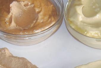 En el vaso de la batidora echar los ajos, la sal y la yema de huevo, triturar bien, si la batidora no lo coge machacarlo con la mano del mortero, por ejemplo. Añadir el ingrediente elegido, los pimientos o la ralladura de la mandarina y el zumo y batir para mezclar bien. Despues ir echando los aceites poco a poco en un hilo mientras se bate para formar el alioli.
