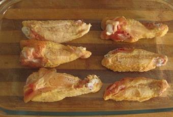 Colocamos las alitas de pollo en una fuente de horno y salpimentamos. Ponemos el horno a calentar a 160-180º C.