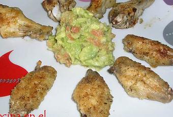 - Servimos el guacamole y colocamos al lado las alitas con el jugo de la bandeja mezclado con perejil picado.