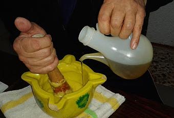 Elaboración: En un mortero picar los dos dientes de ajo, añadirle un poco de sal y la yema de huevo. Remover.