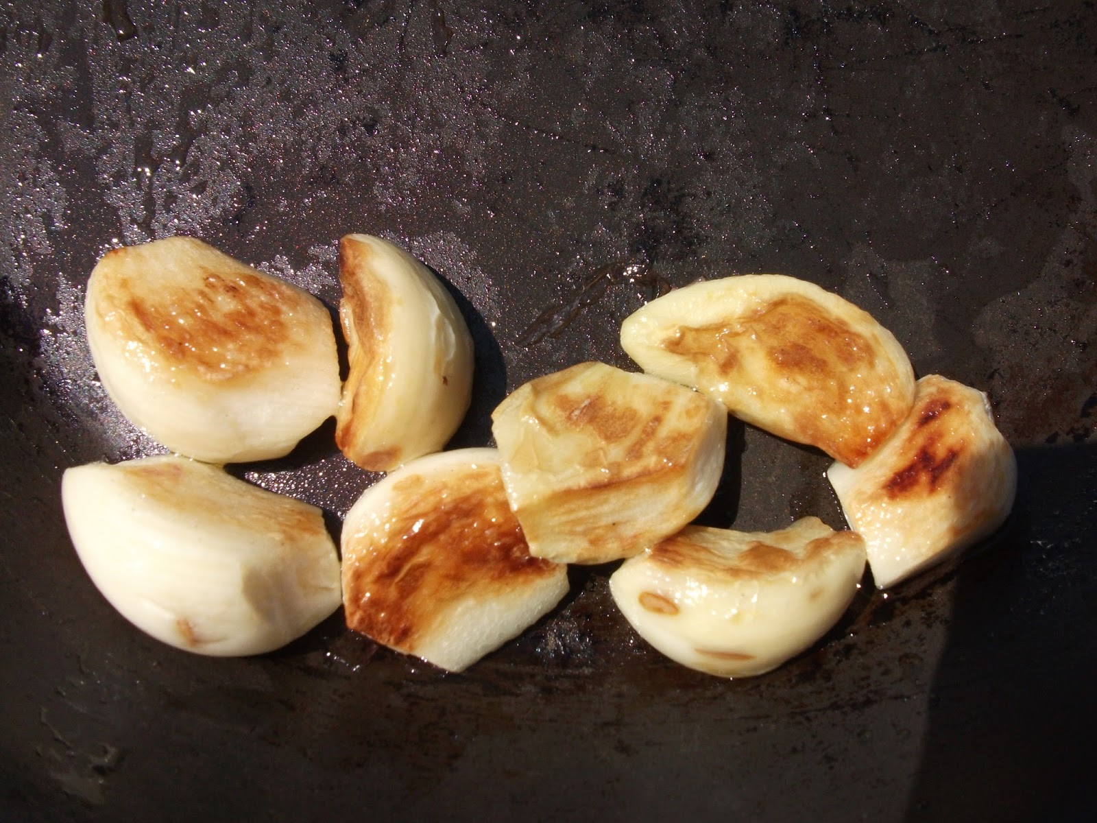 En primer lugar se pelan los ajos y se ponen a fuego bajo en una sartén enteros, con una gotita de aceite, para que se doren un poco por fuera. Esto hará que su sabor cambie, por un lado será más suave y por otro aportará ese regusto a ajo tostado que creo que queda muy bien.