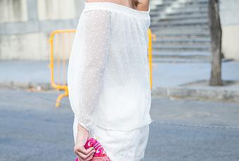 Acabamos la semana con un look en blanco, que es el color que más me apetece llevar con el calor que está haciendo estos días en Madrid, añadiendo un toque alegre y divertido con el bolso de hilo rosa y naranja. Cómo os decía el otro día, me he comprado varias camisetas con los hombros al aire y esta blanca de plumeti es otra de ellas, además fue un chollo porque la encontré arrinconada en las últimas rebajas de Mango ;). Total white outfit to end the week, my favorite summer color! As I told you a few days ago I bought some off shoulder tops and this one I'm wearing today was one of them, do you like it? ;)
