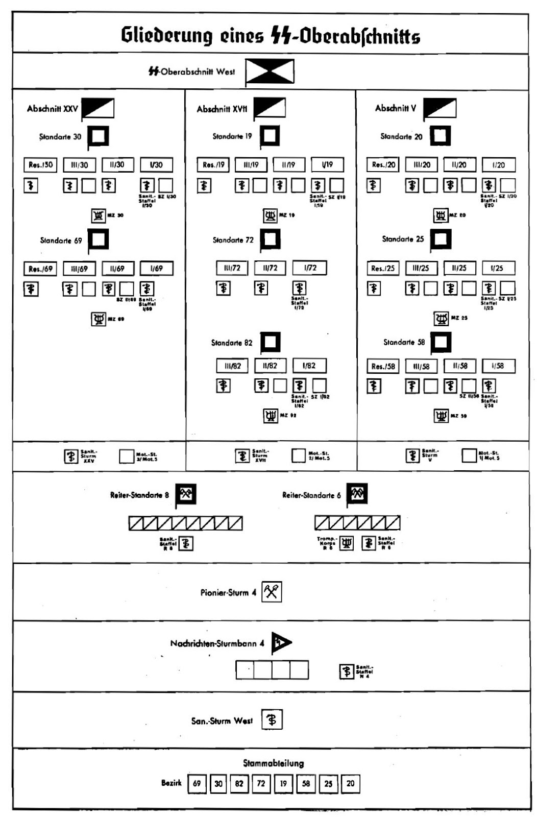 Así mismo, a cada Oa. le correspondía un Sportabteilung o destacamento deportivo, responsable del buen estado físico del personal SS. Hasta 1939 los instructores deportivos de las SS se entrenaban en la escuela de deporte de las SA en Hamm, Westfalia, pero tras la ocupación de Checoslovaquia se establecerá una Reichssportschule de las SS en Praga para formar al personal de las Oa. y publicar manuales de formación física para las SS. También será asignado un Stammabteilung o destacamento suplementario de reserva independiente a cada Oa. Estaba compuesto por hombres mayores de cuarenta y cinco años y por hombres jóvenes que por sus obligaciones con el Estado o el Partido, no podían participar de forma activa en las SS. Un ejemplo de este caso lo serían los oficiales de policía. Los Stammabteilung llevaban el nombre de la Oa. correspondiente y estaban a su vez divididos en Bezirke o subdistritos, cada uno de los cuales trabajaba con un standarte y llevaban el número arábigo correspondiente a este. Se trataba de reservistas que actuaban como complemento de la Allgemeine SS en aquellas funciones que requerían de un esfuerzo suplementario de personal, como desfiles, grandes celebraciones o desastres naturales. Se distinguían por sus uniformes en los que se invertían los colores de las insignias, junto con un fondo gris claro en cuellos y puños; durante un breve periodo de tiempo, llevaron el borde de los brazaletes en gris claro frente al negro habitual.Cada Oa comprendía una media de tres Abschnitte (Ab.) o distritos. Cada Ab. Se identificaba con números romanos o con el nombre de la zona que abarcaban o por el lugar en el que estaba situado su cuartel general. El comandante del Ab. O Führer des Abschnittes (F.Ab.) solía ser un oficial con el grado de SS-Oberführer o Standartenführer. En 1944 había 45 Ab.