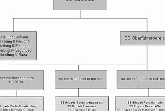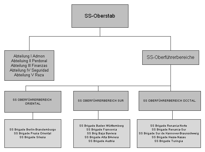 rel=">rel=">rel=" code="" image_src="image_src" /><="">" border="0" height="320" src="http://4.bp.blogspot.com/-XRSpNeBSpew/UXBYQhijnAI/AAAAAAAAAR4/Bc4Dfp02ecM/s320/allgemeinesspardsg2.jpg" title="Allgemeine SS" width="224" />En 1296, se formará una SS-Oberleitung con sede en Múnich, para dirigir los distintos grupos regionales de las SS que se habían ido formando para dar escolta a Hitler y altos dirigentes del Partido en sus desplazamientos por Alemania. Así aunque a cada Gaue del Partido le correspondería un SS-Gaue, realmente sólo se establecerán seis SS-Gaueentre 1926 y 1928:SS-Gau Alta Silesia, con 4 StaffelnSS Gau Baja Baviera, con 3 StaffelnSS Gau Berlin-Brandemburgo, con 2 StaffelnSS Gau Franconia, con 5 StaffelnSS Gau Renania-Sur, con 5 StaffelnSS Gau Sajonia, con 4 StaffelnPara 1930, la SS Oberleitung será sustituida por un SS-Oberstab, organizado de la siguiente manera: Abteilung I Administración, Abteilung II Personal, AbteilungIII Finanzas, Abteilung IV Seguridad, AbteilungV Raza. Por debajo se situaban 3 Oberführer que dirigían su propia zona u Oberführerbereiche; nuevamente cada Gaue del Partido debería contar con una SS-Brigade, cada una de las cueles estaría integrada por varios Standarten, compuestos a su vez por unos 5 Stürme cada uno. Ya que en 1930 había unos 30 Gau del NSDAP, es evidente que las SS aún tenían una distribución territorial muy escasa.