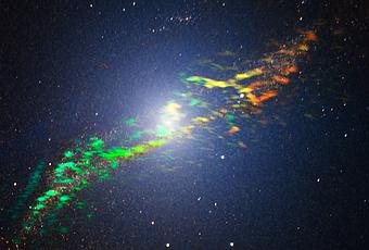 Las observaciones de ALMA están superpuestas a una imagen de Centaurus A obtenida en el infrarrojo cercano por el instrumento SOFI, instalado en el telescopio de ESO New Technology Telescope (NTT). La imagen fue procesada utilizando una técnica innovadora que elimina el efecto de emisión producido por el polvo (eso0944). Podemos ver claramente un anillo de estrellas y cúmulos brillando en un tono dorado, los restos dispersos de la galaxia espiral siendo desmantelados por la fuerza gravitacional de la galaxia elíptica gigante.