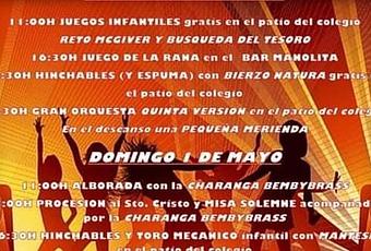 Ya el domingo 1 de mayo, se levantarán con la alborada de la Charanga Bembybrass a las 11 de la mañana, a las 13 horas Procesión del Santo Cristo y misa solemne.