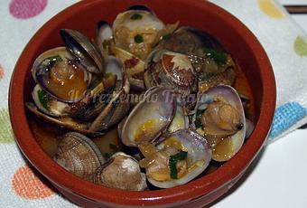En una cazuela de fondo grueso ponemos Aceite de Oliva hasta cubrir el fondo, esperamos a que tenga la temperatura adecuada, mientras el aceite se calienta vamos picando muy pequeñita la cebolla, cuando este caliente el Aceite le ponemos la cebolla para que se vaya haciendo el sofrito, picamos muy pequeño el ajo y cuando la cebolla este transparente le ponemos el ajo y hacemos el sofrito despacio hasta que casi se haya deshecho la cebolla. A continuación añadimos las dos clases de pimentones y sofreímos un poco con cuidado que no se queme, cuando ya este sofrito el pimentón añadimos el harina y la sofreímos hasta que se le quite el sabor a crudo y todo el conjunto este como una pasta, subimos el fuego y añadimos el Vino de Jerez y mezclamos bien hasta que se evapore el alcohol, añadimos la Salsa de Tomate Casera, el agua y las almejas y cocinamos hasta que las almejas se hayan abierto. Apagamos el fuego y dejamos reposar 5 min. y servimos en cazuelitas de barro y espolvoreamos con perejil fresco finamente picado.Es una receta deliciosa y maravillosa, tiene un sabor espectacular.