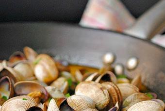 Cuando el conjunto arranque a hervir nuevamente, sazonamos y agregamos las almejas. Tapamos la sartén y esperamos a que se abran, al vapor, antes de retirar del fuego y espolvorear con perejil picado.