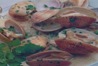 fino; se echa una cucharada de harina, se revuelve rápido y se baña con el vino blanco y el líquido de la cocción; se incorporan las Almejas, se espolvorean con abundante Perejil picado, se da un hervor suave, añadiendo más líquido si fuera necesario, y se sacan a la mesa calientes.