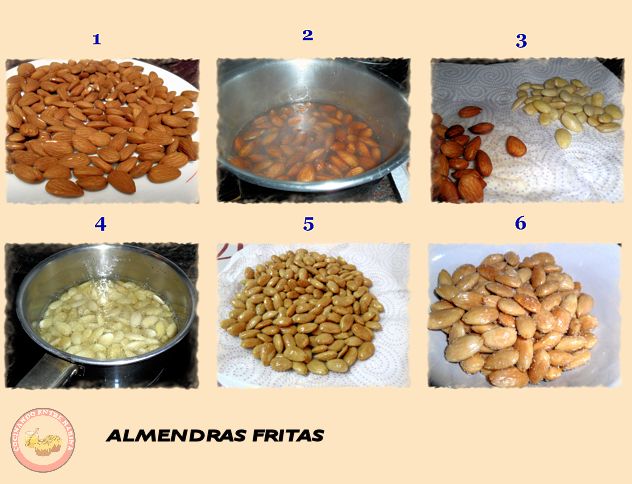 4.- Pon otro recipiente al fuego con abundante aceite de girasol y cuando este caliente (cuando empiece a burbujear) baja el fuego a temperatura media y echa las almendras. Consiste en freírlas a fuego medio y removiendo de vez en cuando, para que se hagan bien por dentro y que se doren pero no se quemen.