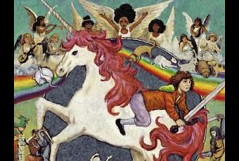 Así, tenemos en primer plano a Rodrigo, que como vemos es un joven no muy listo, ¿a lomos? de un unicornio. En lo alto encontramos ángeles-musas griegas que recuerdan sin duda a las que aparecen en Hércules, la película de animación de Disney. Perritos correteando, una mujer desnuda sobre una vaca... todos ellos tendrán su momento en la formación del Cid y más de uno nos arrancará una carcajada.