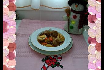 En una cazuela añadiremos aceite de la sartén donde hemos frito las albóndigas añadiremos la zanahoria la cebolla lo las pocharemos un poco añadiremos el tomate rallado. Y cuando ya este cocido añadiremos el vino blanco, hasta que reduzca por ultimo añadiremos los moixarnons puestos en agua previamente para hidratarlos, las patatas previamente fritas y una picada y por ultimo añadiremos unos huevos duros.