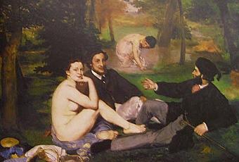Bajo el patronazgo de Napoleón III se celebró en 1863 el Salón de refusés, una exposición de las pinturas que no habían sido consideradas lo bastante buenas para el Salón oficial de Paris.Sin embargo cuando el emperador entró en la sala montó en cólera, la causa del escándalo fue que la figura desnuda que está disfrutando relajadamente de su almuerzo era la representación naturalista de lo que podía ser una mujer de verdad, no la personificación alegórica del pecado o la lujuria, tampoco representaba a ningún ser mitológico.. La mujer representada era claramente moderna. Estaba en compañía de dos hombres que iban vestidos a la moda de la segunda mitad del siglo XIX. De hecho era el retrato de un grupo de figuras fácilmente identificables.Las críticas de la obra fueron demoledoras. La condena de la obra iba de la crítica mordaz a las risitas maliciosas a costa del pintor. Sólo el escritor Emile Zola y otros amigos de actitud abierta apoyaron a Manet, atreviéndose incluso a decir que era “una de las personalidades de la época” y “un hombre valiente que había dado a la exposición brillo, aliento intelectual y el atractivo de lo inesperadamente nuevo”.