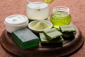 - Ingrediente para mascarillas. El cloro, la sal, el viento, el sol y las altas temperaturas contribuyen a un envejecimiento prematuro de la piel. Para lucir una piel radiante, incluso en verano, una mascarilla de gel de aloe vera, compuesto por vitaminas y antioxidantes, aporta la hidratación y los nutrientes necesarios para mantenerla suave y tersa. Combinado con ingredientes como avena o miel se consigue una mascarilla hidratante, mientras que si se usa con yogur y miel se convierte en un producto facial para combatir erupciones en la piel.