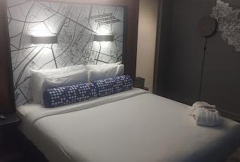 Fecha de entrada: 03/03/2025Tarifa: 205€ SAA mitad de camino entre el Edificio Berlaymont y el Parlamento Europeo, en una tranquila y desangelada plaza encontramos, junto a edificios de oficinas y otros modernos edificios de apartamentos, este cubo, de granito gris, con un gran reloj en una de sus fachadas y las letras de Hotel, sobre un acristalado local de hostelería algo ruidoso. Aunque el establecimiento tiene dos puertas de entrada sólo una funciona, en una calle lateral. Dos puertas correderas automáticas de cristal se abren a un pequeño espacio alfombrado, y otras dos puertas igualmente correderas automáticas de cristal nos dejan en la enorme recepción.Techos altos, con las instalaciones a la vista, poca luz, música moderna algo alta. Hacia la derecha, con una cristalera abierta a la ciudad hay una mesa de billar, un futbolín, algunas butacas, unas taquillas para dejar el equipaje, una mesita con unas bolsas de lavanda para subir a la habitación y favorecer el descanso y los dos ascensores, de puertas metálicas automáticas pintadas de colores. Hacia la izquierda, un poco elevada, una zona donde durante la mañana se sirve el desayuno y el resto del día se venden bebidas y alimentos desde unas neveras. Hacia adelante, amplio y colorista una enorme zona que hace las veces de bar, zona de descanso y tertulia con sofás, maderas, columpios, una zona con juegos de mesa, una barra de bar iluminada, un par de televisiones de generoso tamaño y una chimenea encendida.Junto al mostrador de recepción, con dos puestos de trabajo, ocupados, hay una vitrina con recuerdos a la venta y una mesita con chucherías (caramelos, gominolas) y agua a disposición de los viajeros. Tras una pantalla de ordenador nos atiende simpático un joven que rápidamente chequea nuestra reserva, nos ofrece a reservar el desayuno (cosa que rechazamos), nos explica los horarios y servicios del hotel (wifi incluido), nos da las gracias por nuestra lealtad a la cadena, diciéndonos que nos ha hecho un upgrade a una habitación mejor y nos entrega un cartoncito con la tarjeta de madera que hará de llave de la habitación.Nos acercamos hasta los ascensores, que se accionan acercando la llave a un lector. Por dentro, grandes, metálicos, con la pared del fondo de espejo. enorme botonadura en un lateral. Una pantalla ofrece información sobre los servicios del hotel. Las puertas se abren a un pequeño recibidor con varios carteles en negro que indican la dirección de las habitaciones. Moqueta en tonos oscuros azul verdosos, paredes en azul cielo, techos algo bajos con luminarias de cristal con cenefas de colores que general bastante luz en el pasillo. A derecha e izquierda, junto a pequeños carteles negros se abren las habitaciones con poderosas puertas también en tono azulado con manivelas metálicas y un lector de tarjetas en negro.