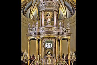 El frente principal está forrado en plata, sus capiteles y molduras taladas y sus adornos dorados. Su planta se formó de un círculo de quatro y media varas, unido a dos triángulos por los costados que extienden su ancho hasta ocho y media varas con la altura de diez y siete. Un zócalo de vara y cuarta recibe la obra y sigue recto hasta las pilastras del presbiterio, dejando dos escalas, a cuyos lados están dos hermosos ángeles con faroles de plata alumbrando el Sacramento. Por su espalda cierra una graciosa baranda, cuyo medio vuela sobre repisa para dejar una mesa de altar. La que mira al frente principal es de dos bellos jaspes cuyas gracias hacen resaltar su base, cornisa, y costados guarnecidos de plata, con un escudo y festones de lo mismo de un estilo serio y magnífico que se hermanan agradablemente para avivar su fondo y aumentar su hermosura.