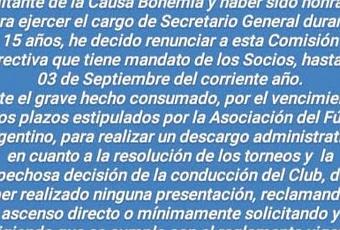 La directiva del bohemio decidió apoyar a Claudio Tapia en la AFA sin levantar la mano por alguna objeción. Como consecuencia, el secretario general Guillermo Alé, tomó la determinación de dar un paso al costado tras 15 años se militancia dentro del club.