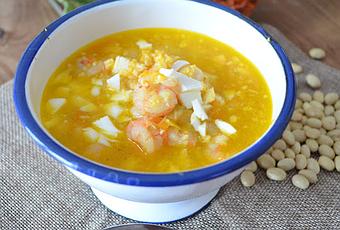 Ingredientes: 4 personas350 gr de alubia amarilla1 puerro1 o 2 zanahorias2 dientes de ajo1/2 cebolla100 gr de gambas peladas1 huevo cocidoaceite de olivasal o pastilla de caldo de pescado