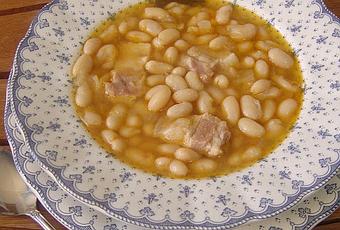 1/2 kgr de alubias blancas2 cebollasuna cabeza de ajos150 gr de tocino4 cucharadas de aceiteuna hoja de laurelsal, pimientauna cucharadita de pimentón: