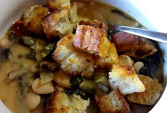 Mientras tanto, tostar las rebanadas de pan en otra sartén. Cortar en trozos y servir la sopa con los picatostes.