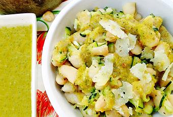 Verter encima de las alubias con calabacín, disponer unas lascas de queso y servir en salsera aparte el resto del pesto.