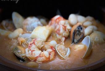Le echamos entonces, los langostinos, los mejillones sin las conchas, la sepia, las almejas y el fumet y ponemos a fuego suave. La cantidad de caldo depende de lo caldoso que nos guste el guiso. Podemos añadirle un poco de agua de los mejillones y de las almejas, pero siempre colado para que no caiga arenilla.