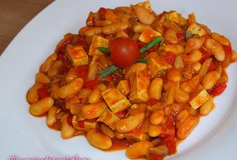 Un plato calentito de alubias con tofu y salsa de tomate.