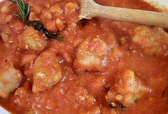 4 salchichas frescas o chorizos, 300 gr. de tomates pelados, salvia, 1-2 dientes de ajo, vino blanco y aceite EVO de Tercio de las Torres.