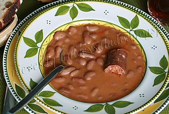 - Añadir los chorizos, el pimentón y el aceite y sacudir la cazuela para que todos los ingredientes se mezclen. (No revolver nunca las alubias con cuchara, pues se desharán. Para removerlas y de éste modo, se ayuda a que espese el caldo, hay que mover la cazuela).