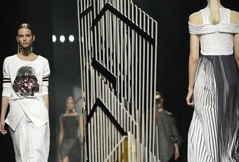 La lucha entre el lado oscuro y el luminoso de Luke Skywalker, protagonista de la saga, aparece representado en las propuestas plisadas y envueltas en un halo de ilusiones ópticas bicolor, blanco y negro, amarillo y verde o rosa y magenta.