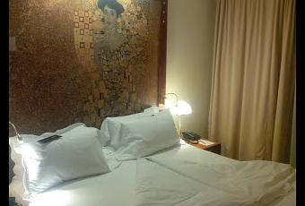 La cama es grande. Mullida, muy mullida gracias al confortable topper que se coloca sobre el colchón. Cómoda. Blanca. Presentada abierta de forma muy curiosa "jugando" con el suave nórdico que la recubre. Cuatro almohadas. A cada lado sendas mesillas en madera. Tras ellas, un par de enchufes disponibles. Sobre ellas unas lámparas de noche de cristal, también de estilo Art Deco. Sobre una de las mesillas, el teléfono, un lapicero y un bloc de notas. Sobre la otra una bandeja con dos tazas, dos infusiones, dos antifaces y dos juegos de tapones para los oídos. Sobre la cama hay un enorme mural de uno de los cuadros más representativos de Gustav Klimt. En el marco que lo bordea hay sendas lámparas de lectura dirigibles, los interruptores para apagar unas cuantas luces (no todas) de la habitación y se remata en la parte de arriba con tres potentes focos.