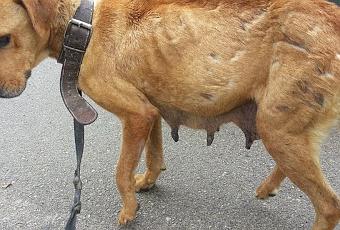 Ama ha sido encontrada hoy en una casa abandonada a las afueras de Ronda, junto a sus 3 cachorros en pésimas condiciones, famélicos y llenos de bichos.