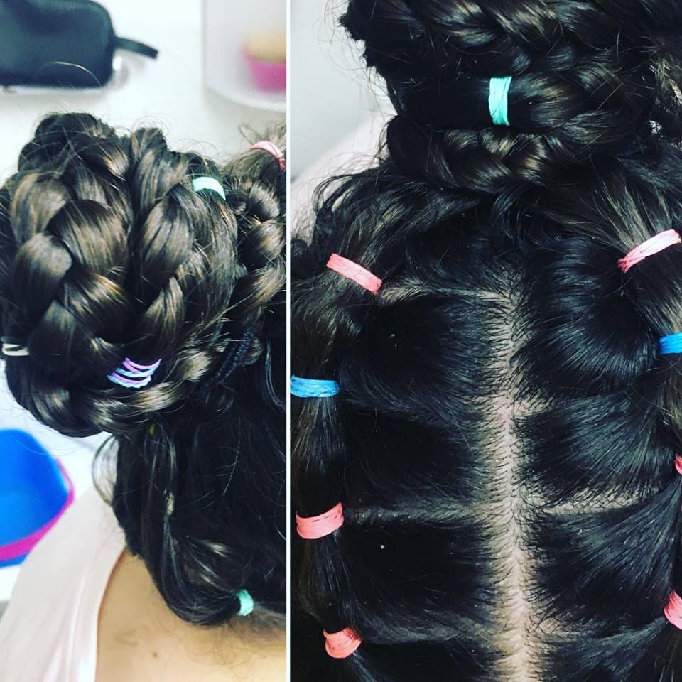 La peluquería se me da fatal a pesar de ser hija y nieta de peluqueros, a mí como que no, pero el otro día por el face vi un video y dije, esto si lo sé hacer yo, y dicho y hecho... y Alejandra tan contenta porque es fácil de hacer aunque un rollo, y aunque en esta foto al final terminó en moño, al día siguiente para ir a la piscina le dejé la coleta con 7 trenzas y tan contenta que fue, máxime cuando estuvo toda la tarde y volvió sin un pelo fuera...