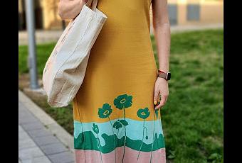 Los pendientes y colgante de dsnu son perfectos con este vestido y la bolsa es de Esther Gili para Cuquiland.