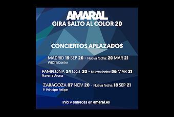 Amaral anuncia que tres de los conciertos de la gira Salto al color se aplazarán al 2021 y ya hay fecha confirmada. Amaral nos presentaba el aplazamiento de la fecha en Madrid al 2021, ahora se suman dos fechas de su gira Salto al color.