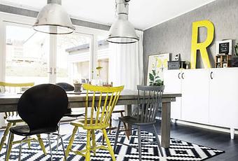 En esta vivienda, en la localidad Skövde, en el sur de Suecia, la propietaria ha decidido convertir el amarillo en hilo conductor del esquema decorativo, y así aunar los diferentes estilos y diversas procedencias de las piezas que lo componen. Es difícil encontrar un solo espacio de la casa donde este color no tenga presencia, bien a través de alguna pieza de mobiliario (sofás, sillas, taburetes) u objetos decorativos, e incluso en alguna de las paredes. La combinación con el negro y el gris, que son los otros dos colores predominantes, es realmente muy efectiva.
