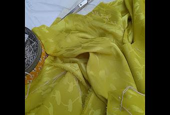 He estado cosiendo una de las telas que compré en la escapada costuril a Los Encantes de Barcelona, es un façonné en color amarillo limón con mucha caída (importante para el modelo que tenía en mente) también tiene un ligero porcentaje de elastán