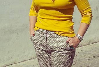 Mi obsesión ésta temporada es el amarillo mostaza. Todas las temporadas me da por un color y ha sido éste por el que se me van los ojos con cada prenda que veo en amarillo mostaza. El look escogido fue muy sencillo, camiseta mostaza, que al ser un color con tanta fuerza preferí combinarlo discretamente con estos pantalones que tienen un precioso estampado geométrico. Zapatos nude, y un collar.