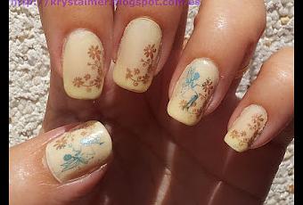 Utilicé la laca de uñas Easy Paris 451 como base, el marrón Colour and Go de Essence 33 Just In Case para estampar las flores y el azul Yes Love N032 para las hadas.
