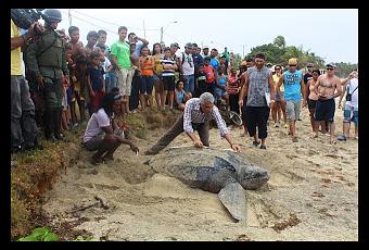 Resulto emocionante para turistas y pescadores presenciar como una ejemplar de Tortuga Cardón (Dermochelys coriacea) fue atendida por servidores públicos del Ministerio del Poder Popular para el Ambiente mientras desovaba en la costa de Playa El Cardón en el municipio Antolín del Campo, Isla Margarita.El bello ejemplar fue avistado por personal de seguridad de un hotel adyacente al lugar de desove quien de inmediato dio parte a las autoridades del Ministerio, quienes procedieron al acordonamiento y protección del animal y posterior traslado de huevos hasta Playa Parguito, con la intención de prestarle mayor seguridad y que puedan concretar la eclosión.