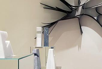 Otras esculturas de A-cero de la colección diseñada en mármol blanco y negro se ven en este hall sobre unos pedestales espejados. En la pared se dispone la escultura Cap Cana basada en el croquis de uno de nuestros proyectos.