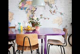 Arriesgada la combinación de la mesa morada con las sillas vintage de madera y hierro pero acertada. Me encanta la dulzura que le da el mapa mundi de la pared y la lámpara azul retro del techo.