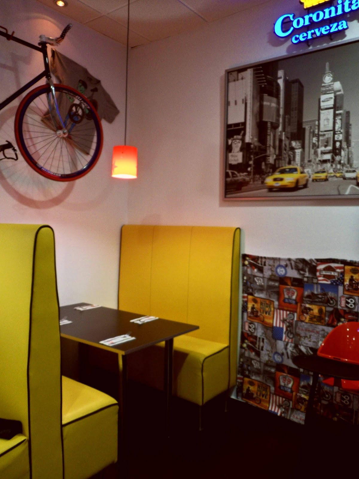 Conozco varios establecimientos de estas características como son el Peggy Sue's, Sloppy Joes o el Merchant's Malt House, pero hoy hablaré de My Way American Restaurant.Está escondido en el número 3 de la calle Úbeda, una paralela a Recaredo. El local combina gustosamente los colores neoplasticistas que inundan mi web por lo que imaginaréis que para mí es un entorno motivador.La carta es muy variada, probamos la hamburguesa New york, el taco y unas patatas con queso, bacon y salsa...SUBLIMES.Voy a dedicar un párrafo a la coca cola porque se lo merece: pagas 3€ y te ponen una preciosa botella de cristal de 35cl y todas las que quieras pagando sólo la primera. Luego están los retos del local. Tienes que superar el tiempo record del anterior ganador que fue capaz de comerse una enorme hamburguesa de varios pisos, una ristra de perritos calientes o una enchilada como la maestranza.También venden productos difíciles de encontrar en España como siropes, salsas barbacoa, dulces o refrescos como estos sabores de fanta tan curiosos que podréis ver en las fotografías.Volveré, eso sí, no habrá entrante, es imposible comerte esas patatas y la hamburguesa. La semana que viene habrá otro post, puede que de otra cena en un a antigua abacería de la que tengo muchas ganas de hablar. Vienen unas amigas y se merecen de lo bueno lo mejor.Espero vuestros comentarios para ir mejorando :)