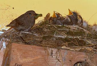 Estos caprichosos colirrojos han decidido utilizar la caja nido que les ha colocado Jose Luis Arriaga en su casa, a su manera. La foto es del día 6 de agosto y los pequeños ya habrán volado por los alrededores de su bonito territorio en Colindres.